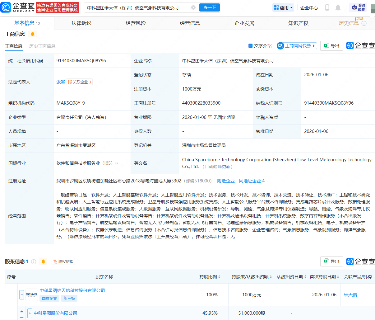近日,中科星图维天信(深圳)低空气象科技有限公司成立,法定代表人为张攀,注册资本为1000万元,经营范围包含:人工智能基础软件开发;人工智能应用软件开发;集成电路芯片设计及服务;智能无人飞行器制造等。企查查股权穿透显示,该公司由中科星图(688568)持股的中科星图维天信科技股份有限公司全资持股。